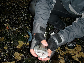 Tiradas as fotos da praxe, voltamos à carga pois quem sabe se não estariam mais na zona à caça. Tal não veio a revelar-se e voltei à dança das amostras. Numa das trocas, vejo a luz do João a apontar para mim e um movimento. Era um belo robalo que ele tinha apanhado mesmo à beira e prontamente o recolheu sem grande alarido!