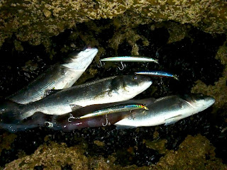 O tempo ia passando, a hora mágica da viragem da maré estava a aproximar-se e a dança das amostras começava, onde se experimenta esta amostra, depois aquela, e porque não a outra que é interessante para aquelas situações... Quem pratica spinning sabe a rotação que as amostras podem ter quando se "adivinha" peixe e não se arranja forma de os estimular a atacar!