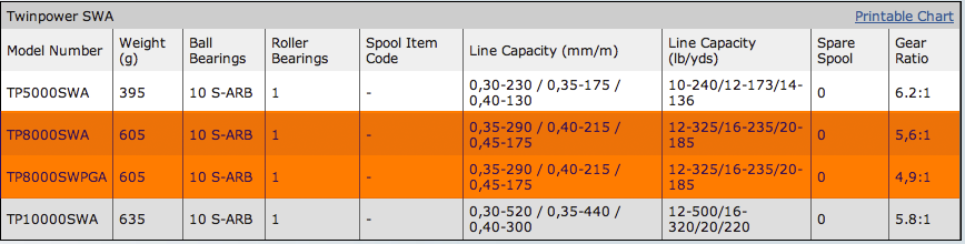 "(...)Anyhow, in Japan they offer 13 domestic reels in different combinations of sizes and gear ratios. The list is too complicated to explain in whole, so check Shimano's Japanese site for the entire line up and feel free to ask me any specific questions Those Japanese models are named SWxxxxxPG/HG/XG. Where PG is Power Gear (low ratio for jigging), HG is High Gear (high ratio for popping), and XG is Extreme Gear or Extra High Gear (even faster ratio). For the US, they offer only 6 of those models. They are named xxxxxSW with no gear designation expect for a single model called 8000SW PG which is a slower ratio version of the regular 8000SW. For the US, the 5000 reels are the smallest of the series, 8000 and 10000 reels have similar bodies with different spool capacities, and the biggest are 18000 (high ratio) and 20000 (low ratio). (..)"