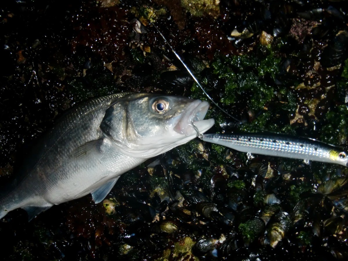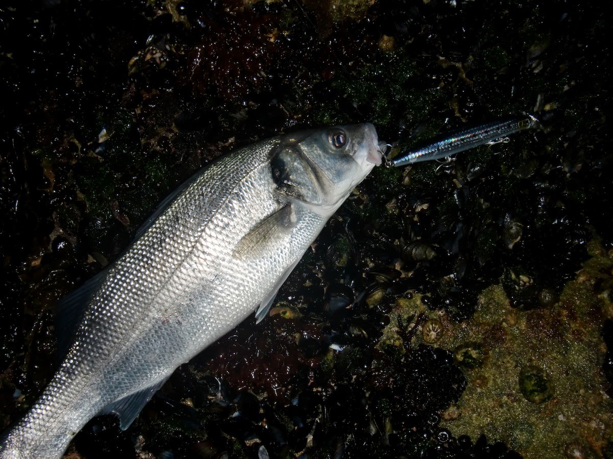 Recolho fio com calma mas sempre em tensão, aproximo-o da pedra e puxo-o para cima, ora aqui está um robalo!